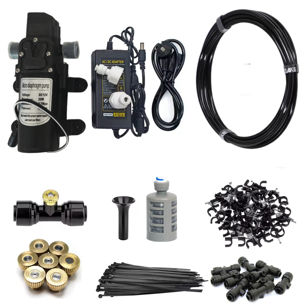 O grande diferencial deste kit é a automatização por bomba de 60W que foi desenvolvida propriamente para esse produto. A bomba produz pressão na proporção exata, garantindo névoa ao invés de respingos, que se espalham uniformemente por uma área muito maior, umidificando e também climatizando todo ambiente, tornando o sistema mais eficaz e econômico.
